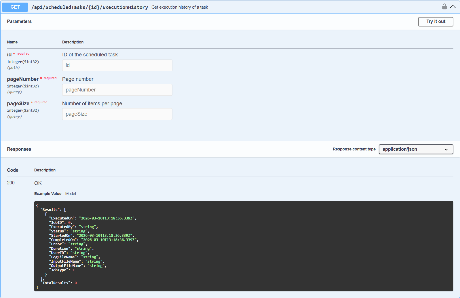 With this endpoint, you can retrieve the Execution History of a single existing Scheduled Task. To consume it, you must be an Authenticated User. Once you have obtained a valid token, it must be passed on the call.