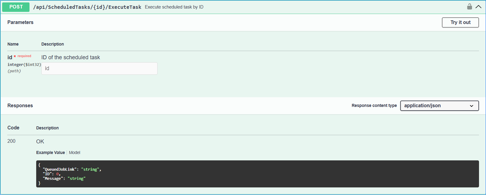 - If the user is authenticated and provides a valid Scheduled Task ID, then the response will be Status Code 200 => OK, with the ID of the new Queued Job that was created and a link to the queued job in JSON format.